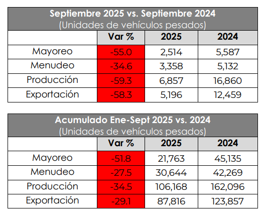 Por su parte, en el mercado externo, durante septiembre de 2025 se exportaron 5,196 unidades de vehículos pesados, mostrando una variación negativa de 58.3% respecto al mismo mes del año anterior. En el acumulado anual, las exportaciones totalizaron 87,816 unidades, lo que representa una disminución de 29.1% frente al mismo periodo de 2024.