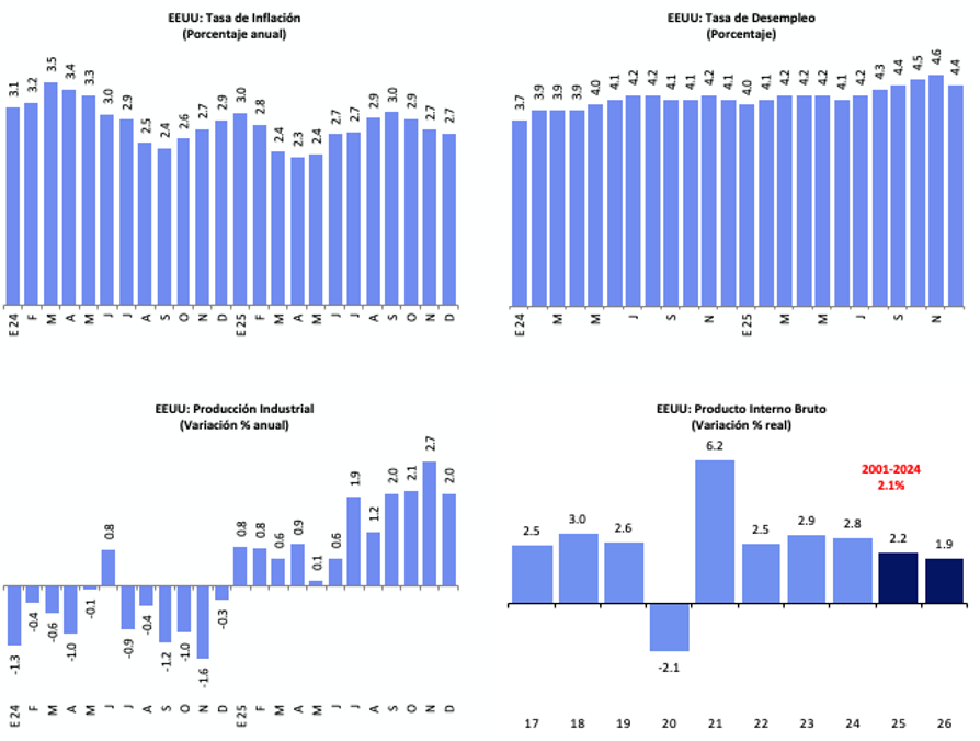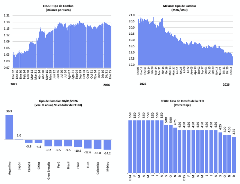 En el ámbito internacional, el primer año del segundo mandato de Donald Trump estuvo marcado por decisiones arancelarias y tensiones con la FED. El Dow Jones ganó 11.5% en 2025, tras una caída inicial de 16%, mientras la Bolsa Mexicana de Valores superó ese desempeño con un alza de 34.2% anual. El dólar se depreció 13.6% frente al Euro en el primer semestre, mientras el peso mexicano se apreció 14.2% frente al dólar en todo el año. En Estados Unidos, la inflación cerró en 2.7%, el PIB creció 2.2% y la producción industrial avanzó 1.3%, mostrando resiliencia pese a las tensiones comerciales.