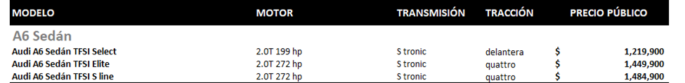El nuevo Audi A6 Sedán, fabricado en la planta de Neckarsulm, se encuentra disponible en todas las concesionarias Audi del país bajo los siguientes precios por versión: