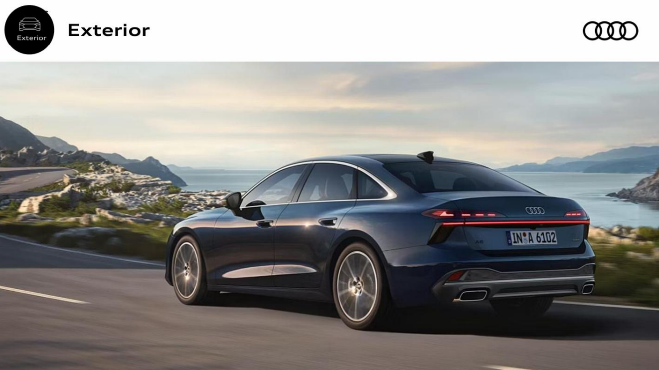 Completamente rediseñado el nuevo Audi A6 Sedán cuenta con un diseño exterior dinámico y musculoso, con líneas minimalistas que combinan elegancia y deportividad. El rasgo más característico es la curvatura del borde superior de las ventanillas, que fluye de manera armoniosa hasta la luneta trasera fija, realzando las formas aerodinámicas de la carrocería. Los blisters que emergen con fuerza de la línea de los hombros, junto a las líneas dinámicas, son un elemento central del ADN de diseño de Audi. En combinación con las anchas vías, representan la deportividad.