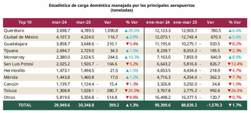 Respecto a la carga nacional, el aeropuerto de Querétaro destacó con un incremento del 6.4%, al mover 12,903.7 toneladas, 780.5 más que en el primer trimestre de 2024. La Ciudad de México también tuvo un desempeño positivo con un alza del 5.6%, alcanzando 12,743.4 toneladas. En contraste, Guadalajara cayó 8.2%, con 10,275.1 toneladas frente a las 11,195.3 del año previo.