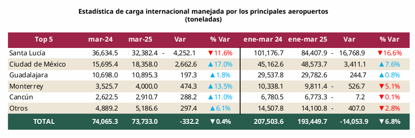En el segmento internacional, el aeropuerto de Santa Lucía mantuvo el primer lugar pese a una disminución del 16.6%, al registrar 84,407.9 toneladas frente a las 101,176.7 del año anterior. Por el contrario, el Aeropuerto Internacional de la Ciudad de México reportó un crecimiento del 7.6%, con 48,573.7 toneladas. Guadalajara también avanzó ligeramente con un aumento de 0.8%, alcanzando las 29,782.6 toneladas. Monterrey cayó 5.1% y Cancún prácticamente se mantuvo sin cambio, con un marginal retroceso de 0.1%.