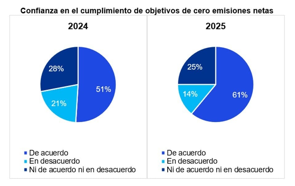 El compromiso con la sostenibilidad se mantiene firme: 61% confía en alcanzar sus objetivos de cero emisiones netas para 2030 (frente a 51% en 2024), gracias a metas intermedias más realistas y mejor alineadas con la estrategia corporativa.