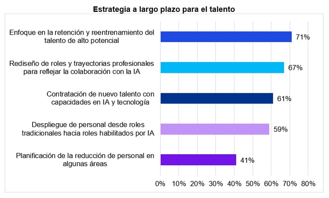 La preparación en IA se ha convertido en una prioridad: 77% de las y los CEO la consideran esencial, mientras que 70% identifica la escasez de talento como una barrera crítica para su adopción. Esto ha impulsado programas de reentrenamiento y la búsqueda de nuevos perfiles, aunque persisten obstáculos: