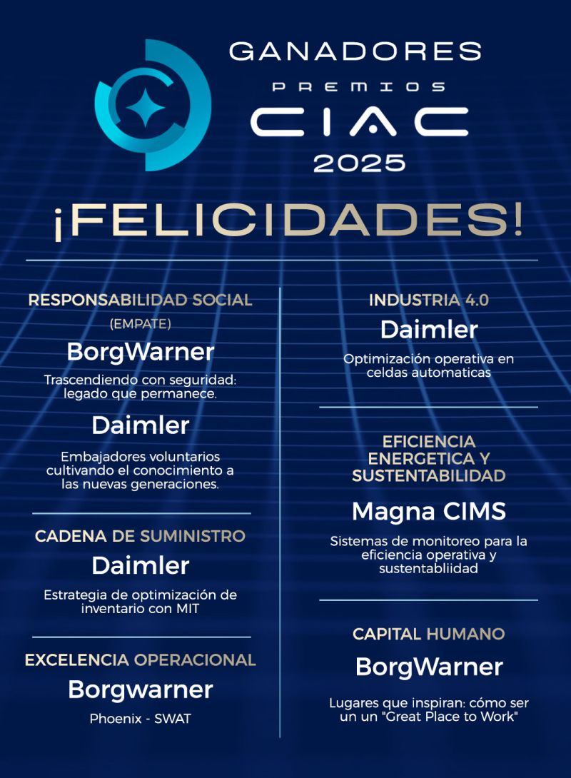 En el marco de la asamblea, se llevó a cabo la entrega de los Premios CIAC 2025, que reconocen iniciativas destacadas en distintas categorías. En Responsabilidad Social, el reconocimiento fue compartido (empate) entre BorgWarner, por su proyecto enfocado en seguridad y legado comunitario, y Daimler, por su programa de voluntariado orientado a la formación de nuevas generaciones. En la categoría de Industria 4.0, Daimler fue distinguida por su estrategia de optimización operativa en celdas automáticas.