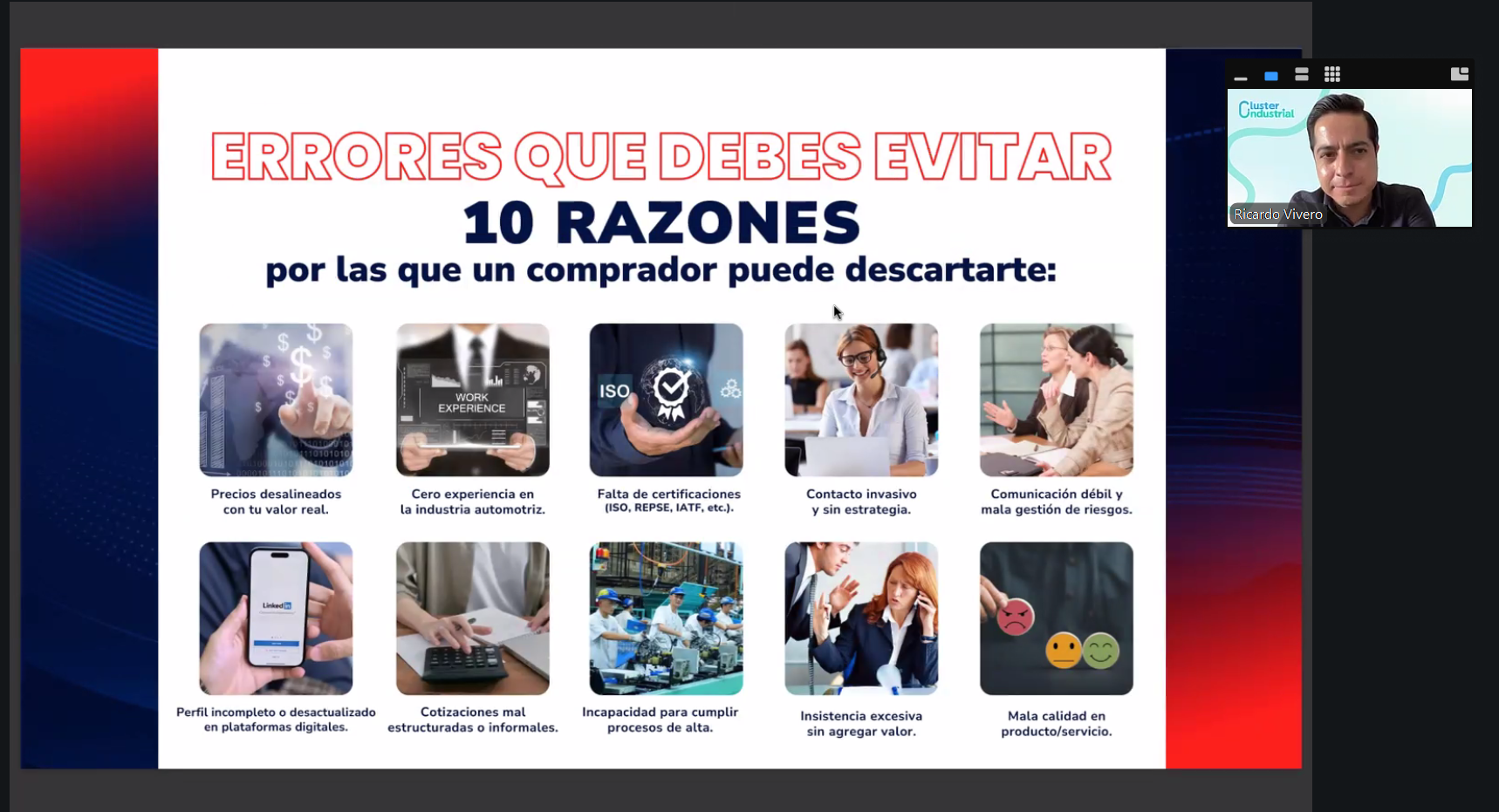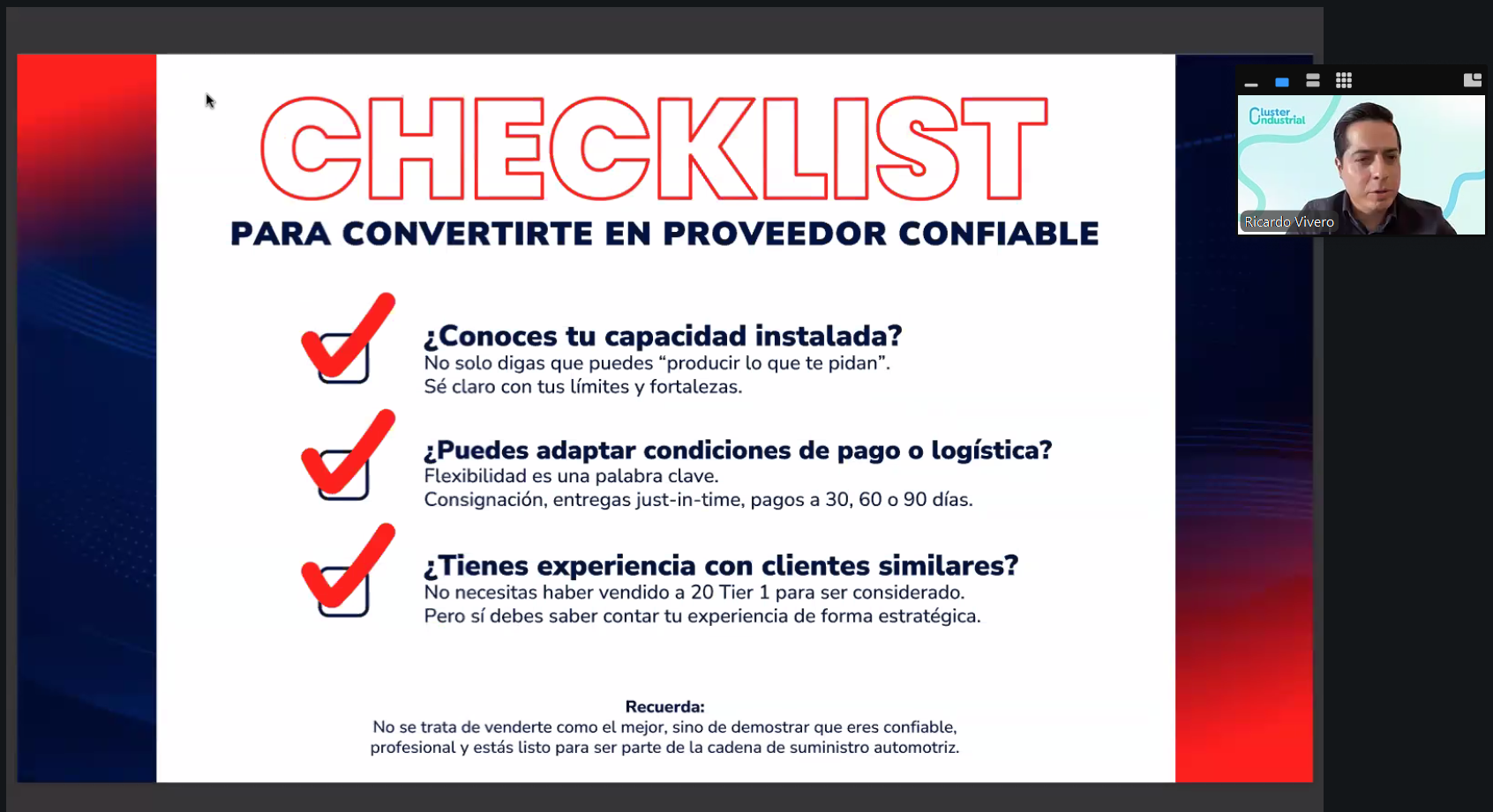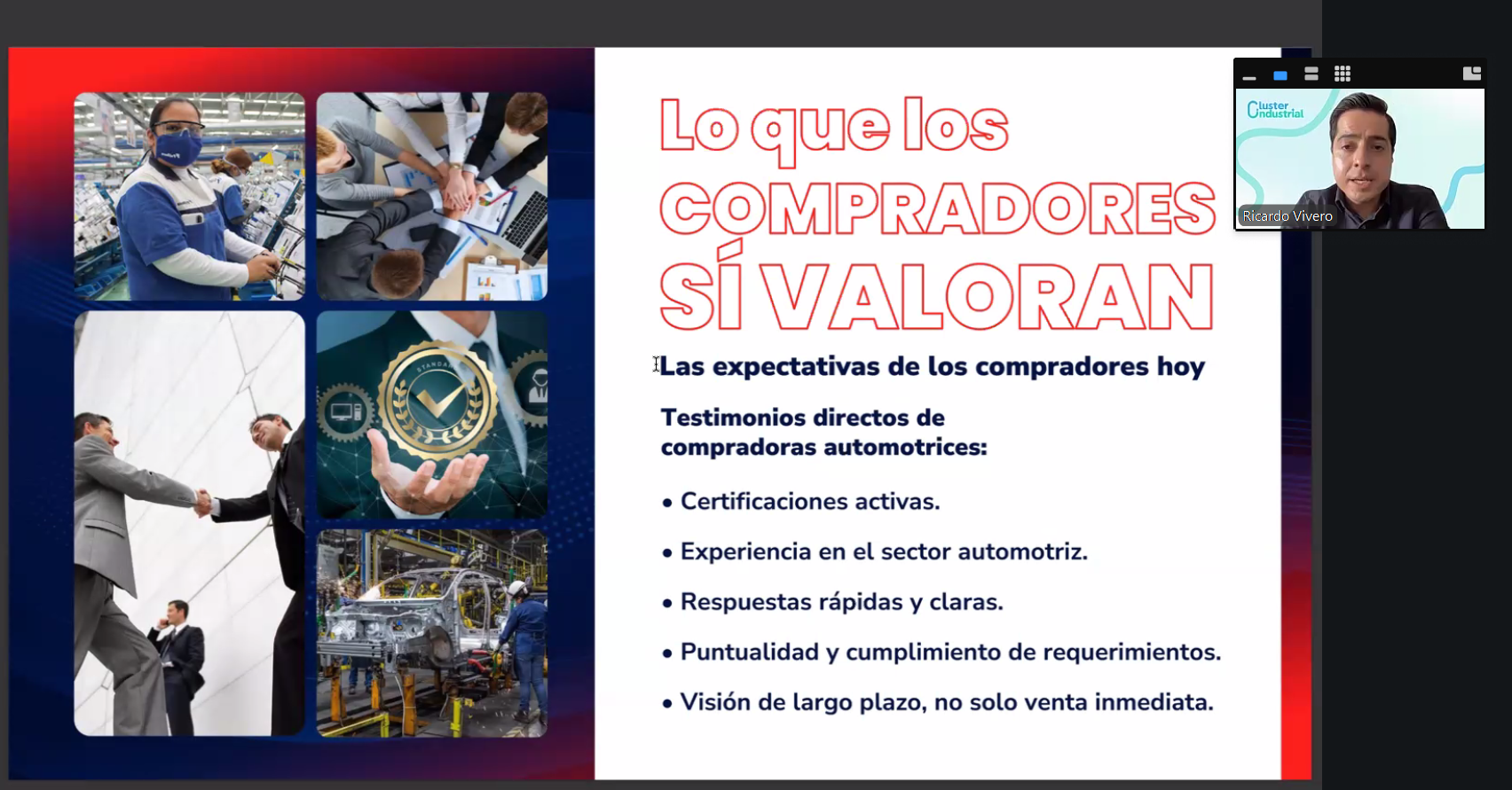 El tema financiero también fue abordado. Vivero explicó que los plazos de pago en la industria automotriz suelen extenderse a 30, 60 o incluso 90 días, lo cual representa un reto para muchos proveedores. Ante esto, resaltó que la estabilidad financiera y la capacidad de adaptarse a estas condiciones son elementos que los compradores evalúan como parte de la confiabilidad de un socio comercial.