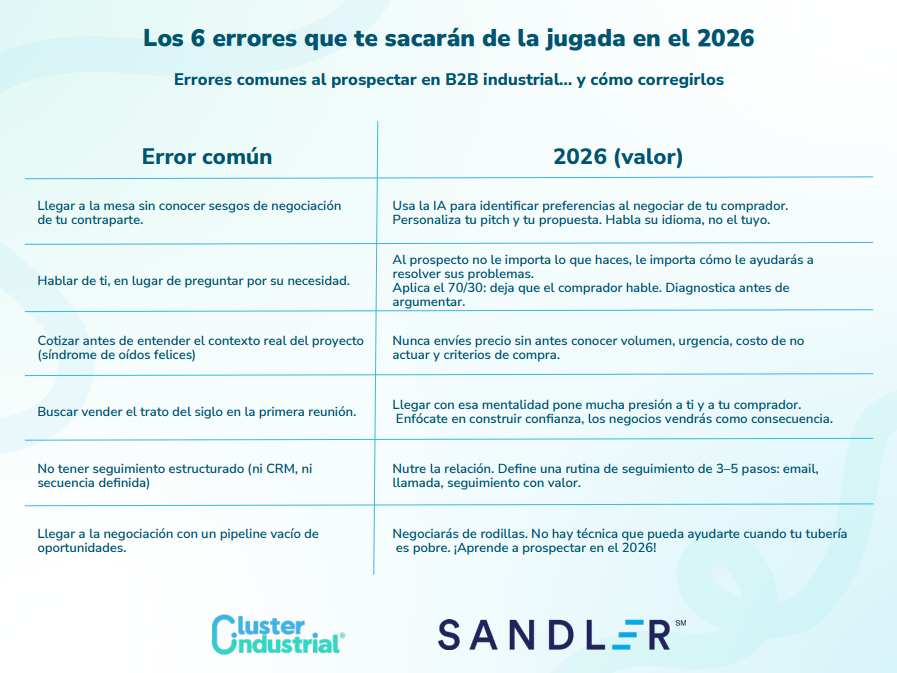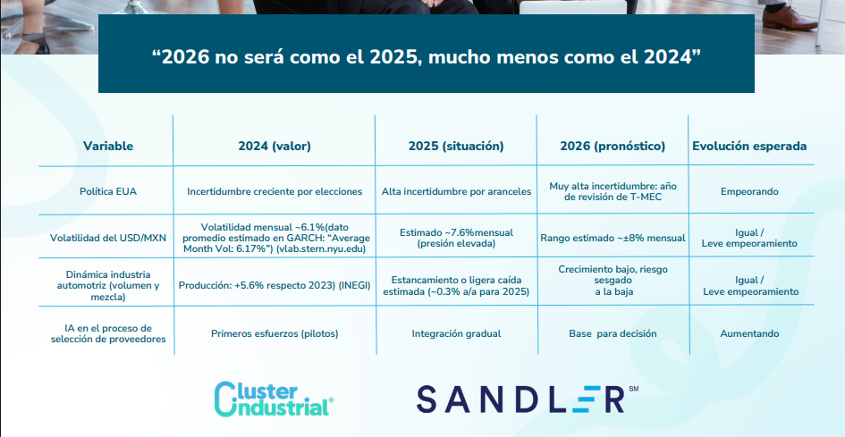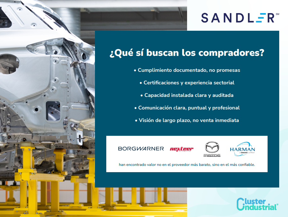 León, Guanajuato, 16 de diciembre de 2025.- El webinar “¿Cómo ser el proveedor que los compradores automotrices buscan en el 2026?” dejó un mensaje necesario para la cadena de proveeduría: la forma en la que los proveedores están vendiendo ha cambiado. A lo largo de la sesión, Dietter Enríquez, Managing partner en Sandler Training Bajío, y Ricardo Vivero, CEO de Cluster Industrial, expusieron con claridad los errores que están cerrando puertas comerciales y las prácticas que sí están permitiendo a algunos proveedores avanzar en procesos de compra, lograr citas relevantes y construir relaciones sostenibles con OEMs y Tier 1.
