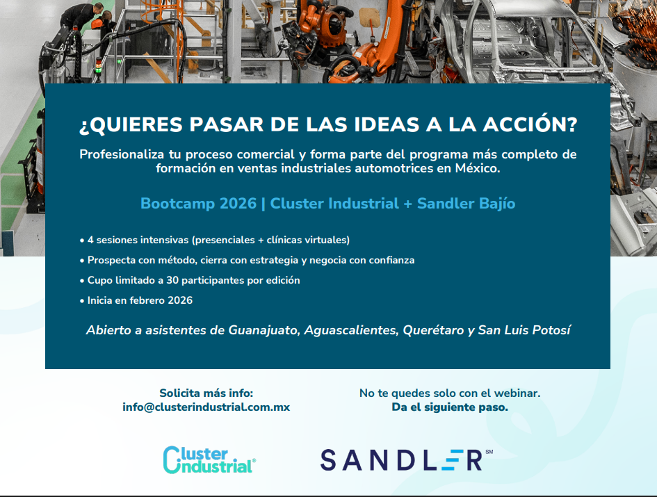 A partir de ese diagnóstico, ambos ponentes presentaron el Bootcamp como una evolución natural del webinar y una invitación para quienes identificaron brechas en su estrategia comercial. Ricardo Vivero explicó que se trata de un programa intensivo desarrollado en conjunto por Cluster Industrial y Sandler, enfocado en acompañar a los proveedores con metodologías probadas para prospectar, negociar y cerrar oportunidades reales en la industria automotriz, mientras que Dietter Enríquez destacó que el enfoque será completamente práctico y accionable, orientado a ejecutar, no a teorizar. El Bootcamp, señalaron, está pensado para empresas que buscan profesionalizar su proceso de venta y alinearse con lo que hoy demandan OEMs y Tier 1, entendiendo que fortalecer la proveeduría no solo beneficia a cada empresa, sino a toda la cadena de suministro que sostiene el crecimiento de la industria.