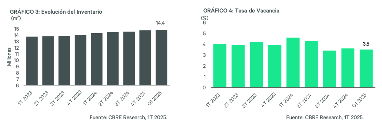 La tasa de vacancia se mantiene con ligeras variaciones, cerró el 1T 2025 en 3.5%, menor a la del 1T 2024 (4.6%).