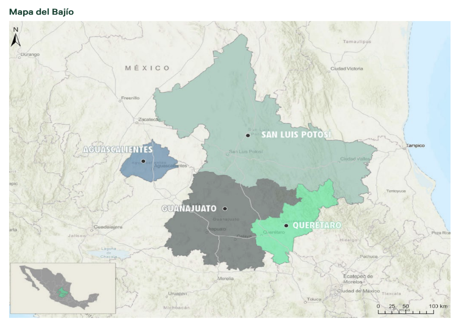 De acuerdo con cifras de la Secretaría de Economía, en 2024 las entidades que conforman el Bajío (Aguascalientes, Guanajuato, Querétaro y San Luis Potosí) sumaron 4,334 millones de dólares de Inversión Extranjera Directa (IED). De las cuatro entidades, Guanajuato y Querétaro fueron los mayores receptores de inversión en la región, de países como Japón, Alemania y Canadá. Recaudaron el 47% de la IED de la región del Bajío.