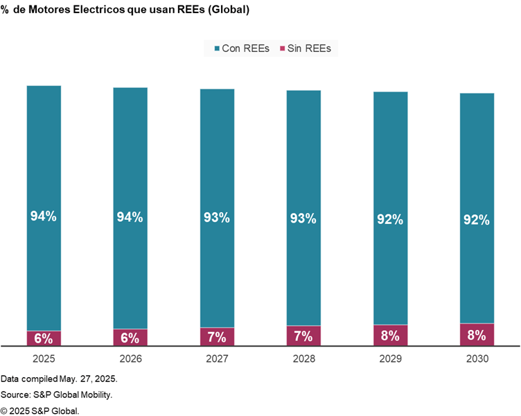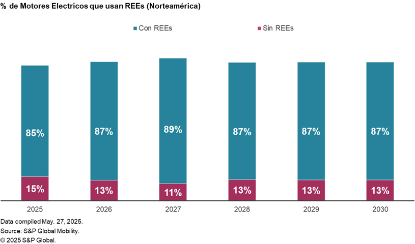 La situación es similar en el mercado de Norteamérica. De acuerdo con el equipo de propulsión por parte de S&P Global Mobility, se proyecta que, durante 2025, la producción mundial de motores eléctricos para vehículos con diferentes niveles de electrificación (híbridos y eléctricos) sumará aproximadamente 60 millones de unidades. Los fuertes volúmenes de producción se obtienen considerando que un vehículo eléctrico puede tener múltiples motores eléctricos por unidad; mientras que se proyecta que en China se manufacturen 29 millones de unidades, se espera que en Norteamérica se produzcan aproximadamente 4.5 millones de motores eléctricos para el mismo año. La proyección para Norteamérica indica que para 2030, este número aumentará hasta 14.5 millones de motores eléctricos, y la industria seguirá dependiendo en gran medida de aplicaciones que requieren imanes permanentes como se muestra en la gráfica “% de Motores Eléctricos que usan REEs (Norteamérica).