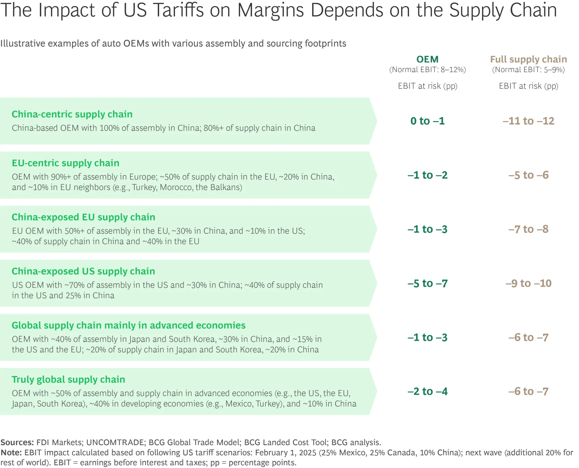 La exposición al riesgo está estrechamente ligada a la dependencia de los fabricantes del mercado estadounidense para sus ventas y de China para sus suministros. El impacto es particularmente pronunciado en los fabricantes de automóviles y sus cadenas de suministro. Por ejemplo, los OEM estadounidenses que dependen de China para una parte significativa de su abastecimiento de piezas podrían enfrentar una caída de entre 5 y 7 puntos porcentuales en sus márgenes, lo que representa una disminución de hasta el 75%. Las caídas en márgenes a lo largo de toda la cadena de suministro que atiende a estos OEM podrían llegar a los dos dígitos. En contraste, para los OEM con cadenas de suministro más globales, el riesgo para los márgenes EBIT es de 1 a 3 puntos porcentuales, mientras que para sus cadenas de suministro el riesgo es de 6 a 7 puntos porcentuales. (Véase el gráfico).