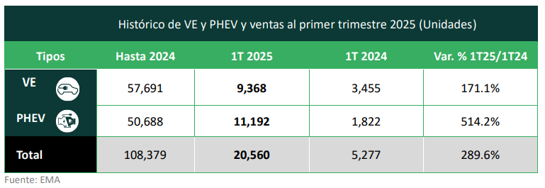 De enero a marzo de 2025, las compañías afiliadas a EMA comercializaron 20,560 unidades de VE y PHEV, un extraordinario crecimiento si se compara con las 5,277 unidades vendidas en el mismo plazo de año pasado, detalla el Barómetro de Electromovilidad realizado por la asociación que agrupa a las principales empresas que promueven la transición a la movilidad eléctrica en el país.