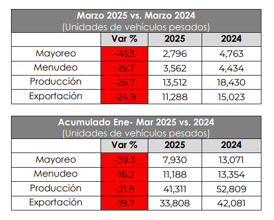 Al abordar los resultados en ventas al mayoreo correspondientes a marzo y al acumulado del primer trimestre del año, el presidente de la asociación detalló que, durante marzo, se comercializaron 2,796 unidades, lo que representa una caída de 41.3% respecto al mismo mes de 2024. En tanto, en el acumulado de enero a marzo, la venta de vehículos pesados suma 7,930 unidades, cifra 39.3% menor frente a las 13,071 colocadas en igual periodo del año pasado.