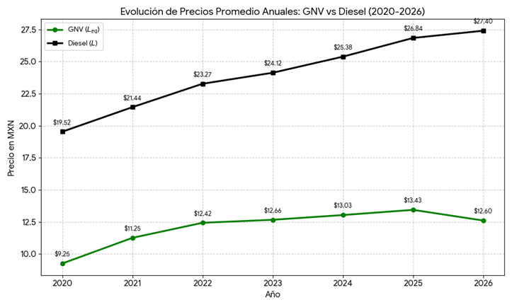 Entre 2020 y enero de 2026, el ahorro observado del GNV frente al diésel se ha ubicado entre 46.6% y 54%, lo que permite a las flotas planear su costo por kilómetro con mayor certidumbre y reducir la exposición a ajustes inesperados en el precio del combustible. En un sector donde el combustible representa entre 30% y 40% de los costos operativos, esta diferencia se traduce en una ventaja competitiva directa.