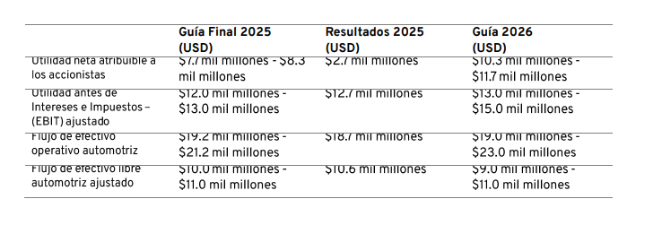 La siguiente tabla resume la guía financiera de GM para 2025 y los resultados de 2025, así como la guía para 2026, que anticipa un año de sólido desempeño financiero