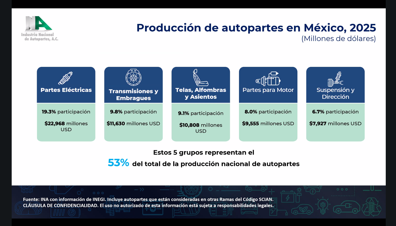 En términos de estructura productiva, la fabricación de autopartes en México continúa concentrándose en ciertos segmentos clave. El principal grupo corresponde a partes eléctricas, con 22,968 millones de dólares y una participación de 19.3% del total nacional. Le siguen transmisiones y embragues, con 11,630 millones de dólares y 9.8%, así como telas, alfombras y asientos, que alcanzaron 10,808 millones de dólares y 9.1% de participación.