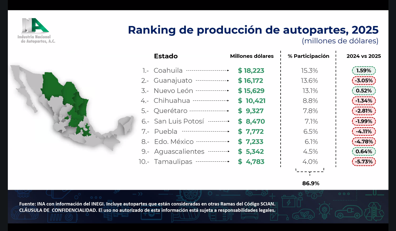 La producción también muestra una fuerte concentración geográfica. El ranking de estados productores coloca a Coahuila en la primera posición con 18,223 millones de dólares, lo que representa 15% del total nacional y un crecimiento de 1.59% respecto a 2024. En segundo lugar se ubica Guanajuato, con 16,172 millones de dólares y 13.6% de participación, aunque con una disminución de 3% frente al año previo.