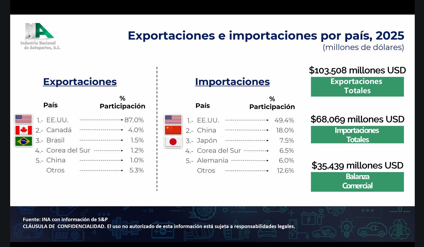 Por el lado de las importaciones, México adquirió autopartes por 68,069 millones de dólares en 2025. El principal proveedor fue Estados Unidos, con 49.4% del total, seguido por China con 18%, Japón con 7.5%, Corea del Sur con 6.5% y Alemania con 6%.