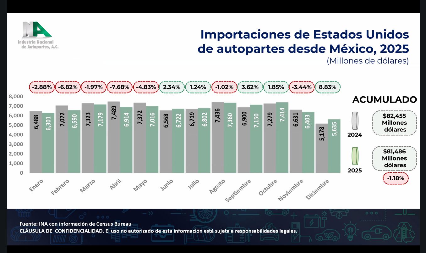 A pesar de esta reducción global, las importaciones estadounidenses provenientes de México mostraron un comportamiento distinto. En diciembre de 2025, las compras de autopartes mexicanas crecieron 8.83% frente a diciembre de 2024, reflejando la fortaleza de la integración industrial entre ambos países y el papel clave de México como socio estratégico dentro del ecosistema automotriz de Norteamérica.