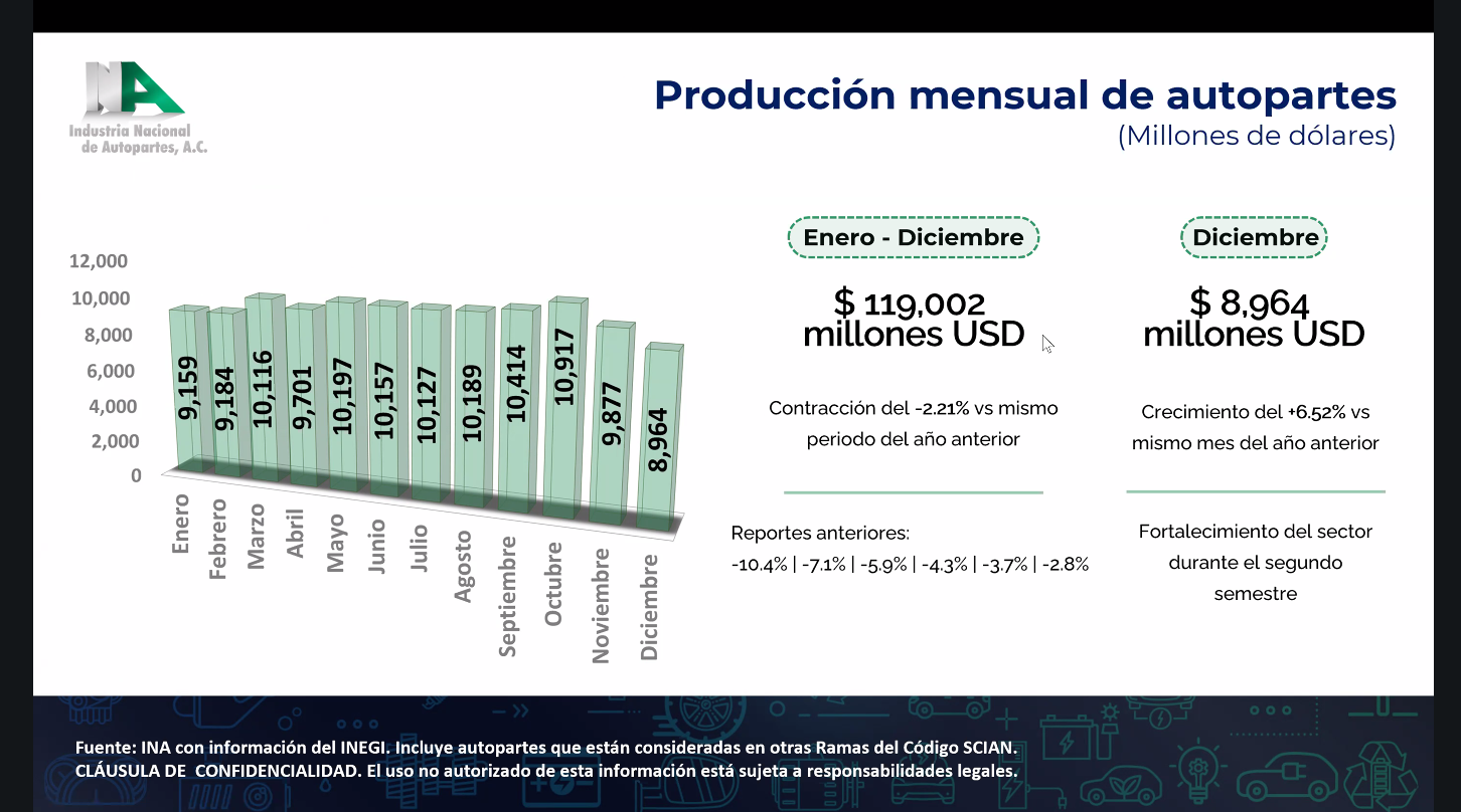 De acuerdo con la información presentada por la Industria Nacional de Autopartes (INA), el valor de producción del sector alcanzó 119.002 millones de dólares durante 2025, lo que representó una contracción de 2.21% respecto a 2024, año que se mantiene como el mejor registrado para la industria con 121,689 millones de dólares. A pesar de este descenso moderado, el comportamiento mensual evidenció una recuperación progresiva a lo largo del año.
