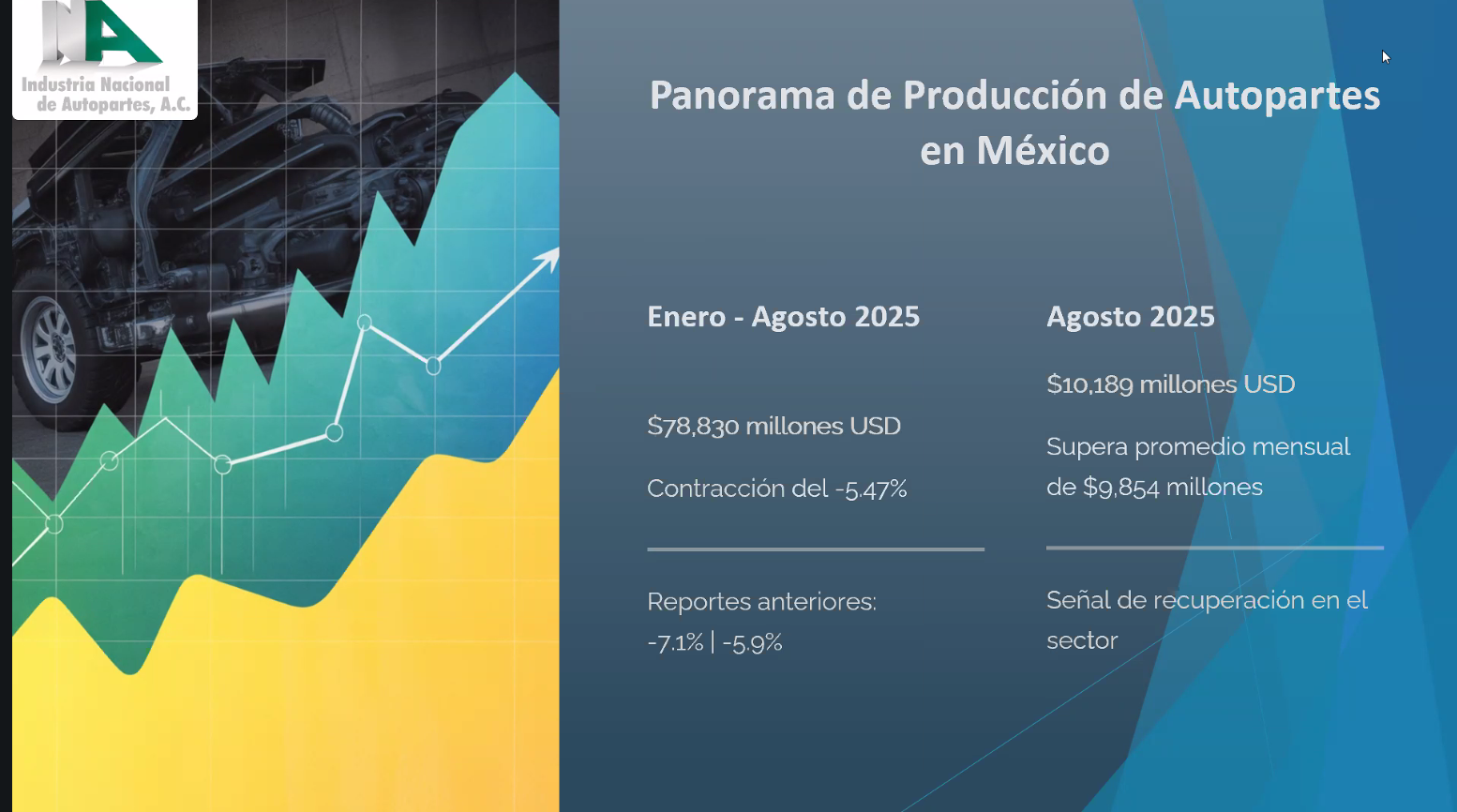 Ciudad de México, 10 de noviembre de 2025.– La Industria Nacional de Autorpartes (INA) reportó un valor de producción acumulado de 78,830 millones de dólares entre enero y agosto de 2025, lo que representó una contracción de 5.47% respecto al mismo periodo del año anterior. Sin embargo, la caída se ha desacelerado, ya que en julio la variación fue de -7.1%, mostrando signos de recuperación en agosto, cuando se alcanzaron 10,189 mil millones de dólares, cifra similar a la de 2024.
