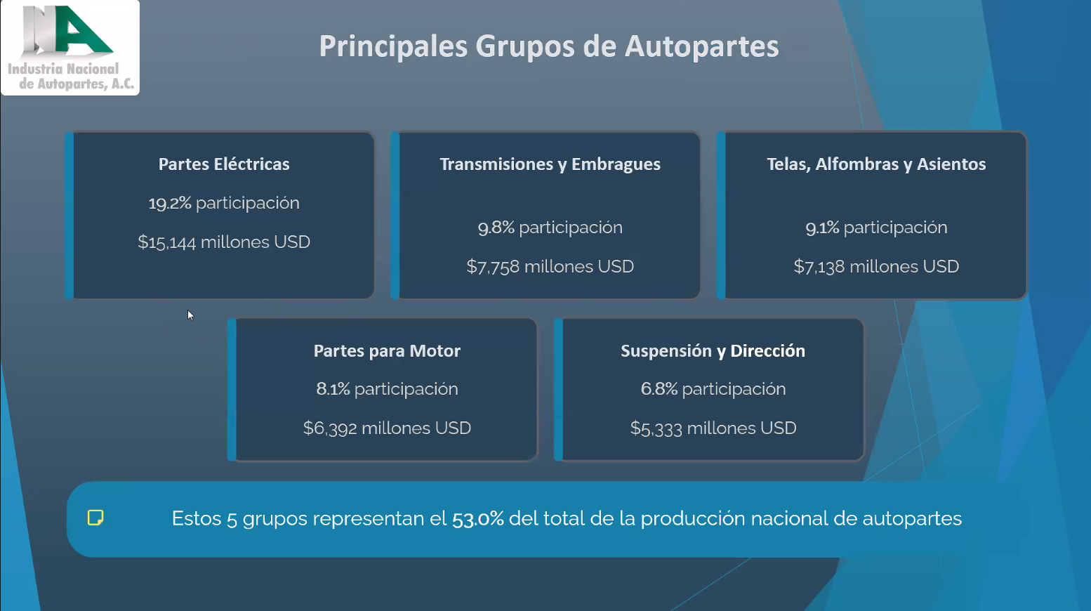 El desempeño de la industria ha sido estable pese a las adversidades del entorno económico y comercial. Entre los principales grupos de componentes producidos destacan las partes eléctricas, que concentraron el 19.2% del total, con un valor de 15,144 mil millones de dólares. Les siguieron las transmisiones y embragues (9.8%), telas y alfombras de asientos (9.1%), partes de motor (8.1%) y sistemas de suspensión y dirección (6.8%). En conjunto, estos cinco grupos representaron el 53% de la producción nacional.