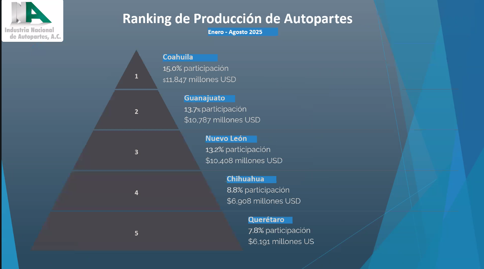 Por entidades, Coahuila se mantuvo como el líder nacional en producción de autopartes con 11,847 mil millones de dólares (15% del total), seguido por Guanajuato con 10,787 mil millones (13.7%) y Nuevo León con 10,408 mil millones (13.2%). Les siguieron Chihuahua (8.8%) y Querétaro (7.8%). En conjunto, los cinco estados concentran 58.5% de la producción nacional.