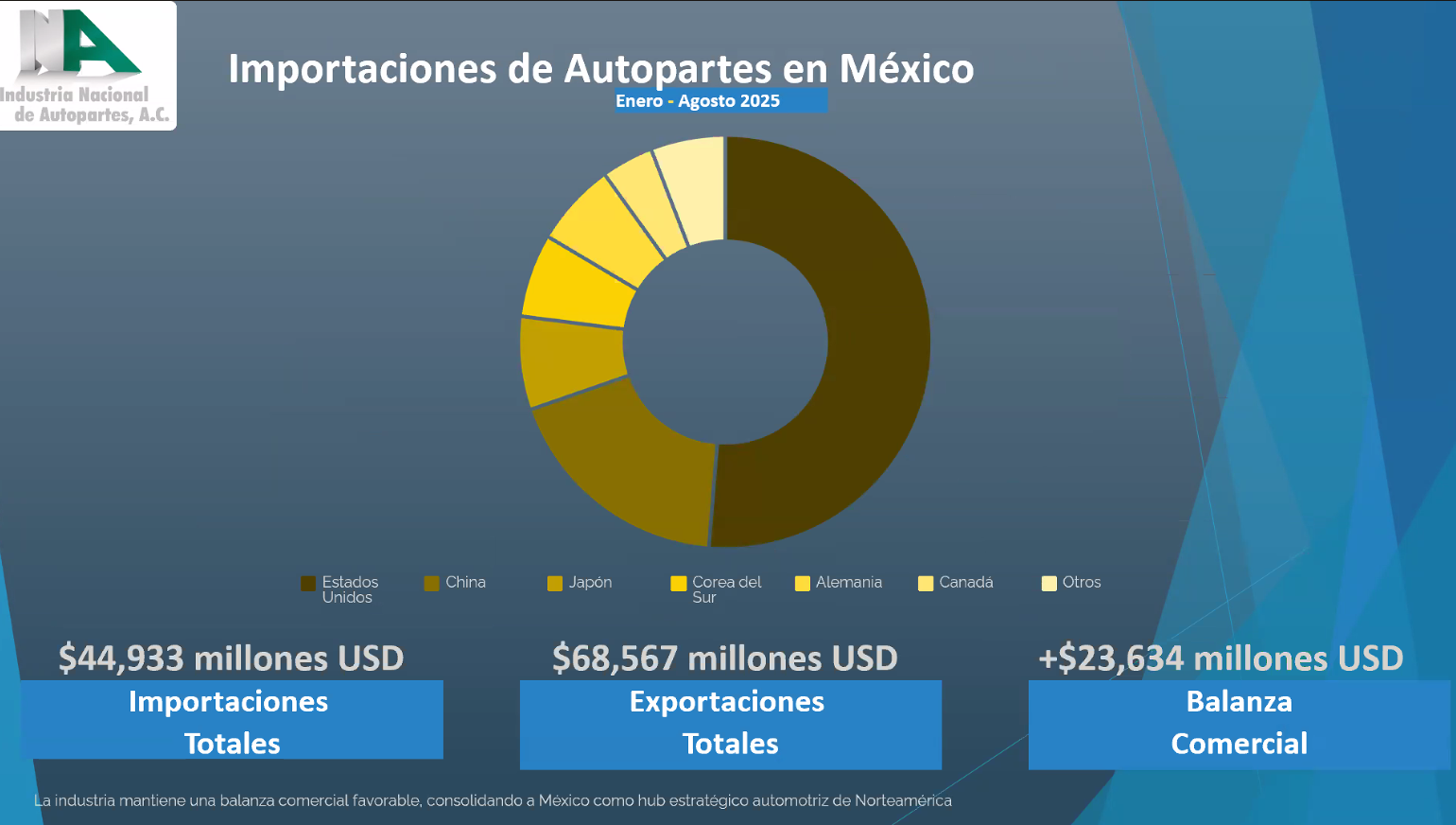 Las exportaciones de autopartes representaron 86.98% de la producción total, con Estados Unidos como principal destino (86%), seguido por Canadá (3.6%) y Brasil (1.1%). En contraste, las importaciones provinieron principalmente de Estados Unidos (52%), China (18.5%), Japón (7.2%), Corea del Sur (6.4%) y Alemania (3.9%), generando una balanza comercial positiva de 23,634 mil millones de dólares.