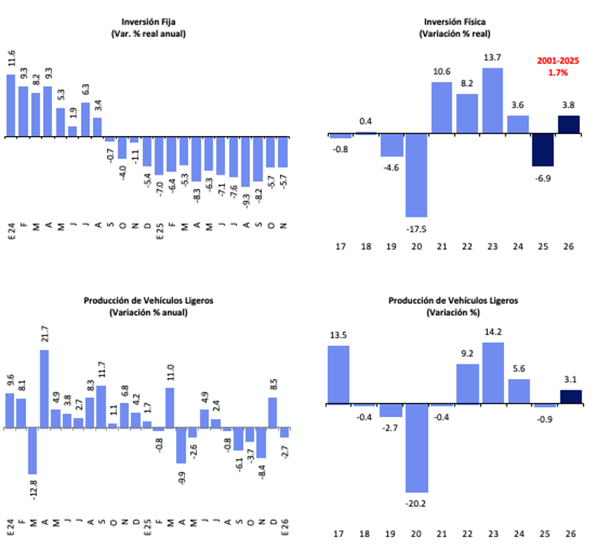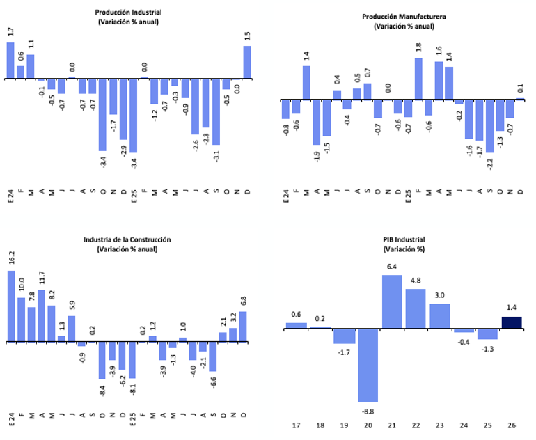 La producción industrial mostró señales de recuperación en diciembre, con un crecimiento de 1.5% anual, su mejor dato en casi un año, tras 20 meses en negativo. La construcción repuntó 6.8% anual, con tres meses consecutivos al alza, y se espera que crezca 2.5% en 2026, lo que podría impulsar al sector industrial en su conjunto.