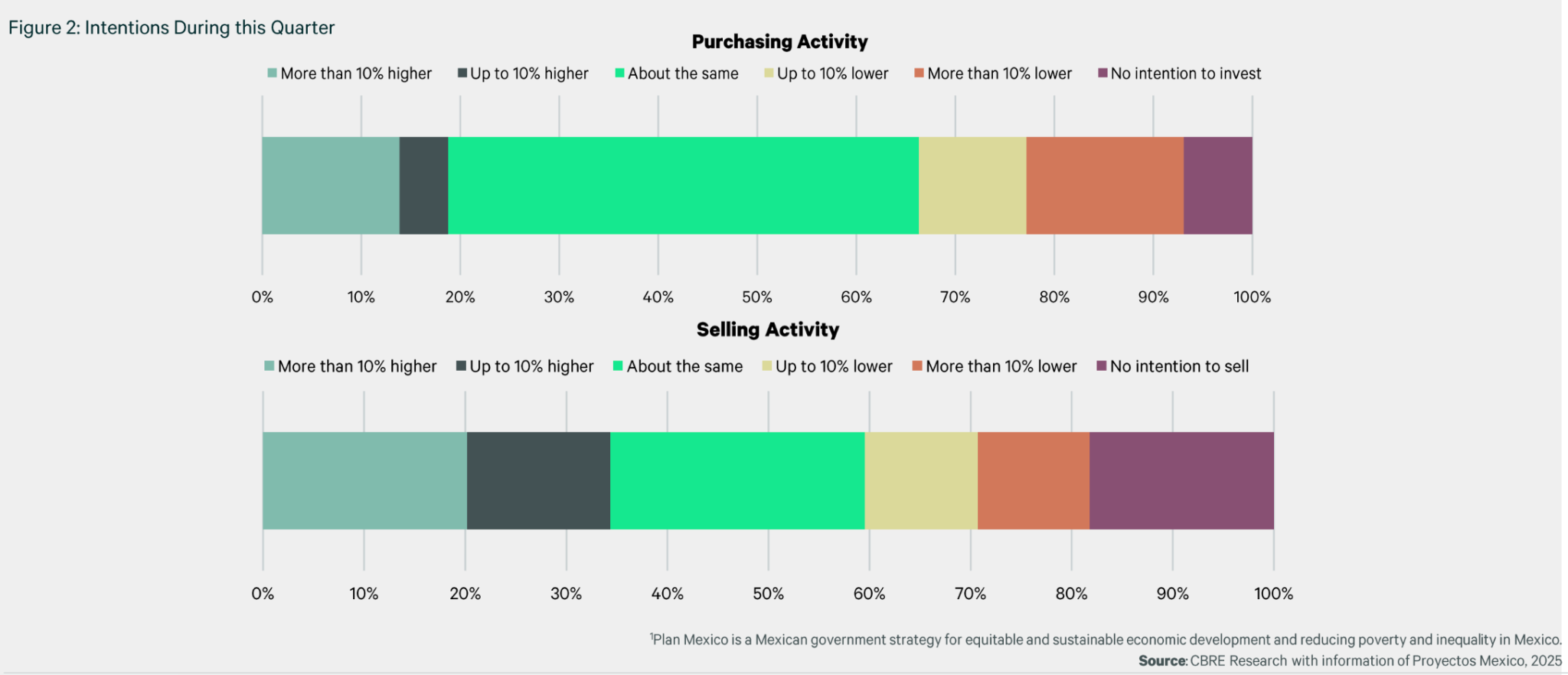El 67 % de los inversionistas planean mantener o aumentar la inversión inmobiliaria respecto al año pasado. A pesar de los vientos en contra de la economía, el gobierno mexicano lanzó el Plan México, desarrollando estrategias diseñadas para crear un entorno favorable para atraer inversionistas y aumentar la entrada de capital al país. El plan se centra en el desarrollo de la infraestructura, el crecimiento económico y la creación de empleo.