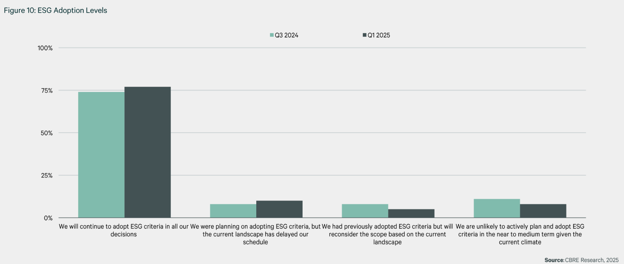 Los inversionistas están adoptando cada vez más criterios Ambientales, Sociales y de Gobierno Corporativo por sus siglas en inglés ESG, para sus decisiones de inversión inmobiliaria. El 77 % de los inversionistas seguirán adoptando criterios ESG en todas las decisiones de inversión. Se espera que una aceptación generalizada de ESG anime a los inversionistas a adaptar y actualizar sus activos actualmente no ecológicos para reducir las emisiones de carbono.