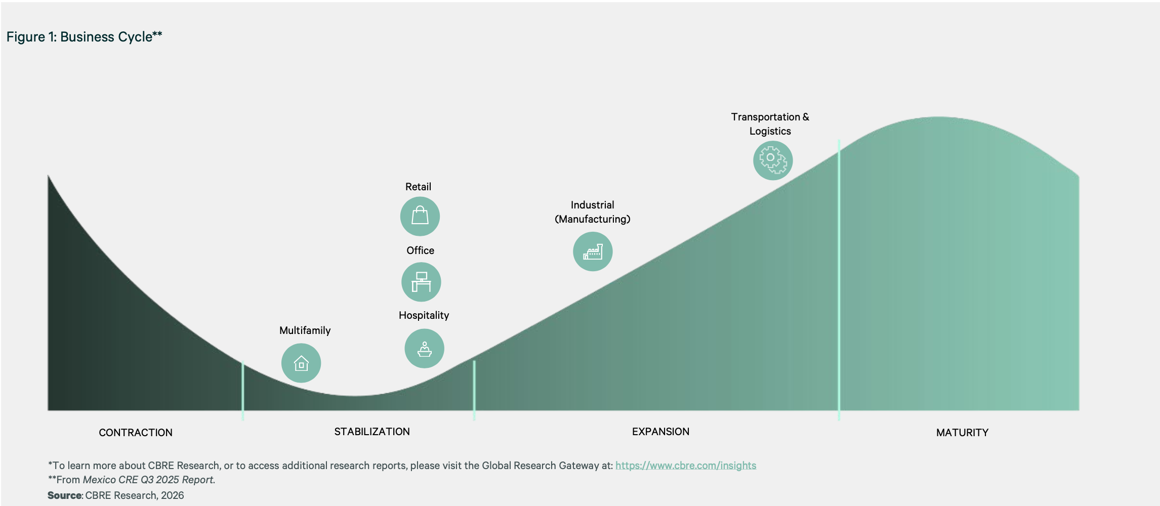 El estudio muestra que el sector de Transporte y Logística continúan liderando la fase de expansión, reforzando el crecimiento del sector industrial, mientras que Oficinas y Retail muestran señales de estabilización, lo que en conjunto apunta a un panorama sólido y resiliente para la industria.