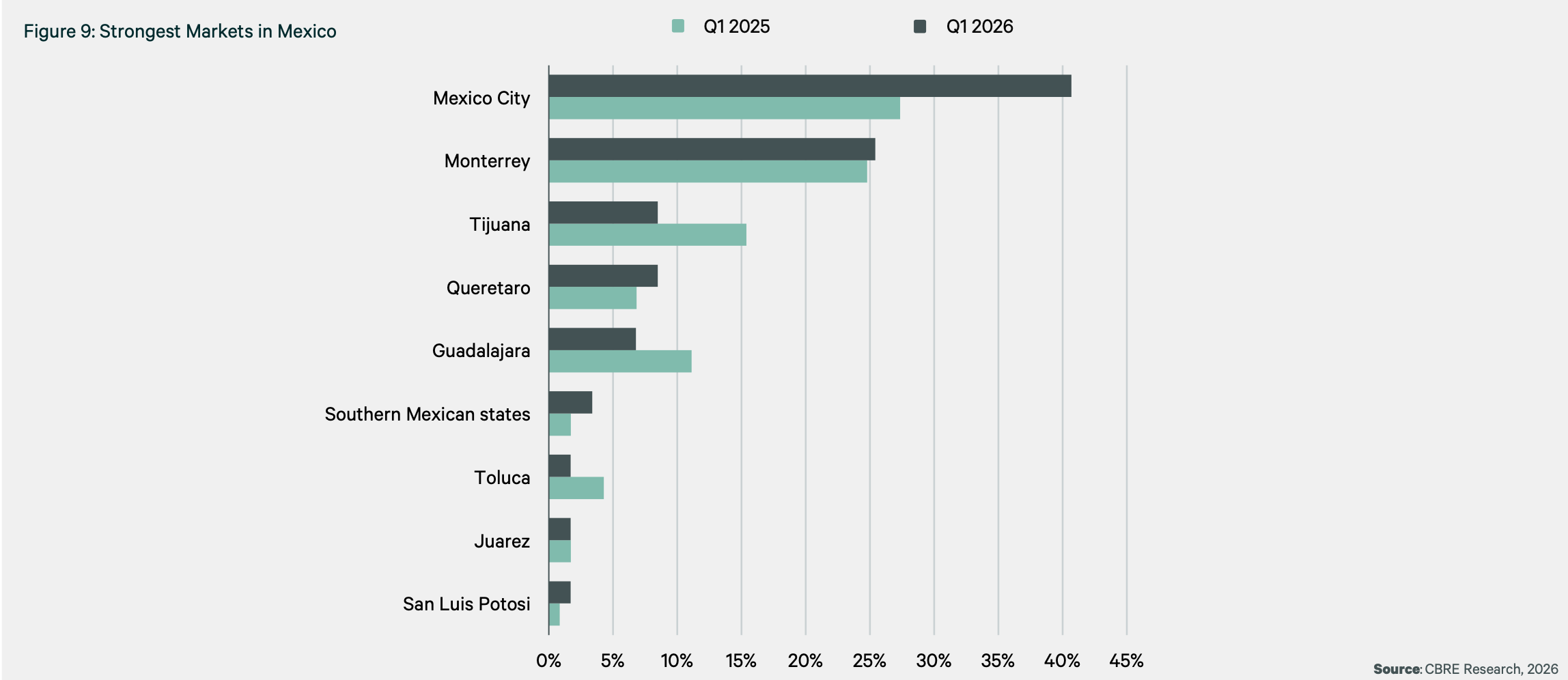 En cuanto a mercados, Ciudad de México se mantiene como el principal destino de inversión del país, mientras que Monterrey muestra estabilidad.