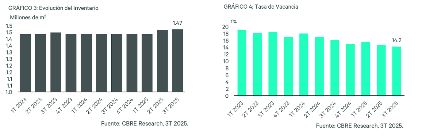 Al término del tercer trimestre de 2025 se registró un crecimiento de 3 mil m2 en el mercado de oficinas de Monterrey, cerrando en 1.47 millones de m2 de clase A y A+ existentes. Esta cifra representa un crecimiento anual del 2.4%.