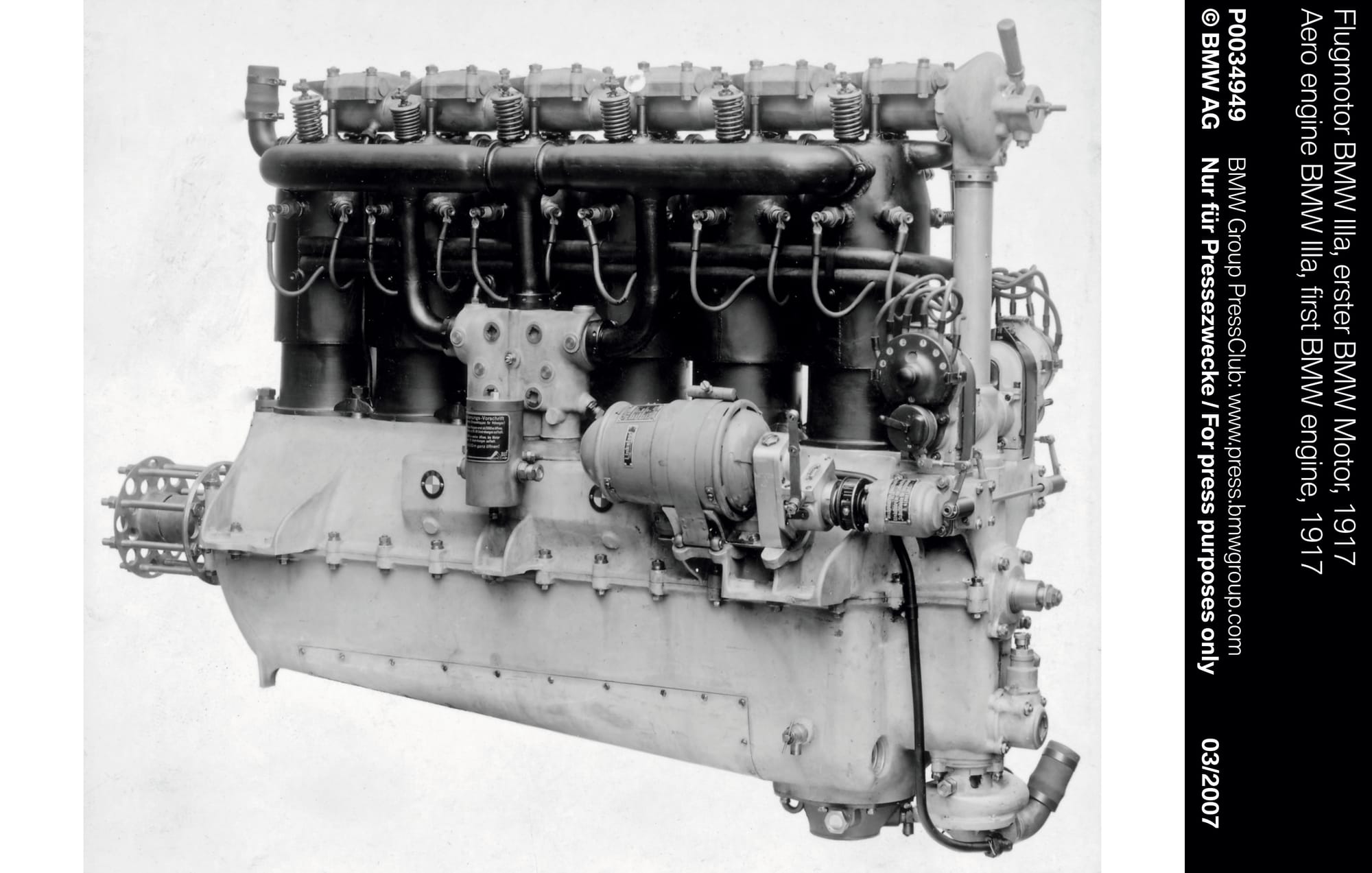 BMW significa "Placer de Conducir Puro" – ya sea en dos o cuatro ruedas. Originalmente podrían haber usado "Placer de Volar Puro", porque poco después de la fundación de Bayerische Motoren Werke – mejor conocido por nosotros por el acrónimo BMW – los ingenieros desarrollaron el primer motor de la compañía en 1917: el motor de aeronave BMW IIIa. Este motor se caracteriza por su diseño técnico sofisticado, que previene la pérdida de rendimiento a grandes alturas. Con el modelo mejorado Motor IV, BMW incluso estableció un récord de altura no oficial de 32,021 pies (o 9,760 metros) en 1919. Este trabajo pionero y la fiabilidad del ensamblaje permitieron al joven BMW ocupar una posición líder desde el principio.