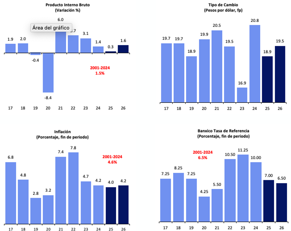 La economía mexicana enfrenta una fuerte desaceleración, afectada por condiciones internas desfavorables y por el entorno arancelario desde Estados Unidos. El PIB local habría crecido apenas 0.3% en 2025 y se espera que se reanime un tanto para 2026 (1.6%). Lo anterior con base en el reinicio de la inversión pública y cierta recuperación del empleo.
