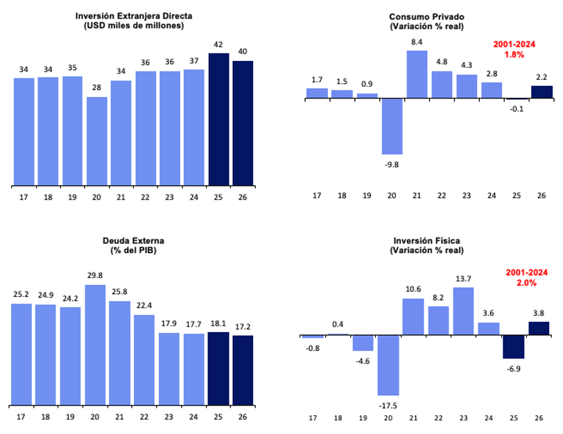 El sector industrial, que pesa casi un tercio del PIB nacional, habría retrocedido 1.6% en 2025. Ha sido afectado por descensos en sus cuatro segmentos: minería, electricidad, construcción y manufacturas. A pesar del entorno arancelario desde Estados Unidos, las manufacturas caerían levemente en 2025 (0.4%), aunque ligaría dos años malos. Las manufacturas deben reaccionar un tanto en 2026. El sector industrial “rebotaría” levemente: 1.5% en 2026.