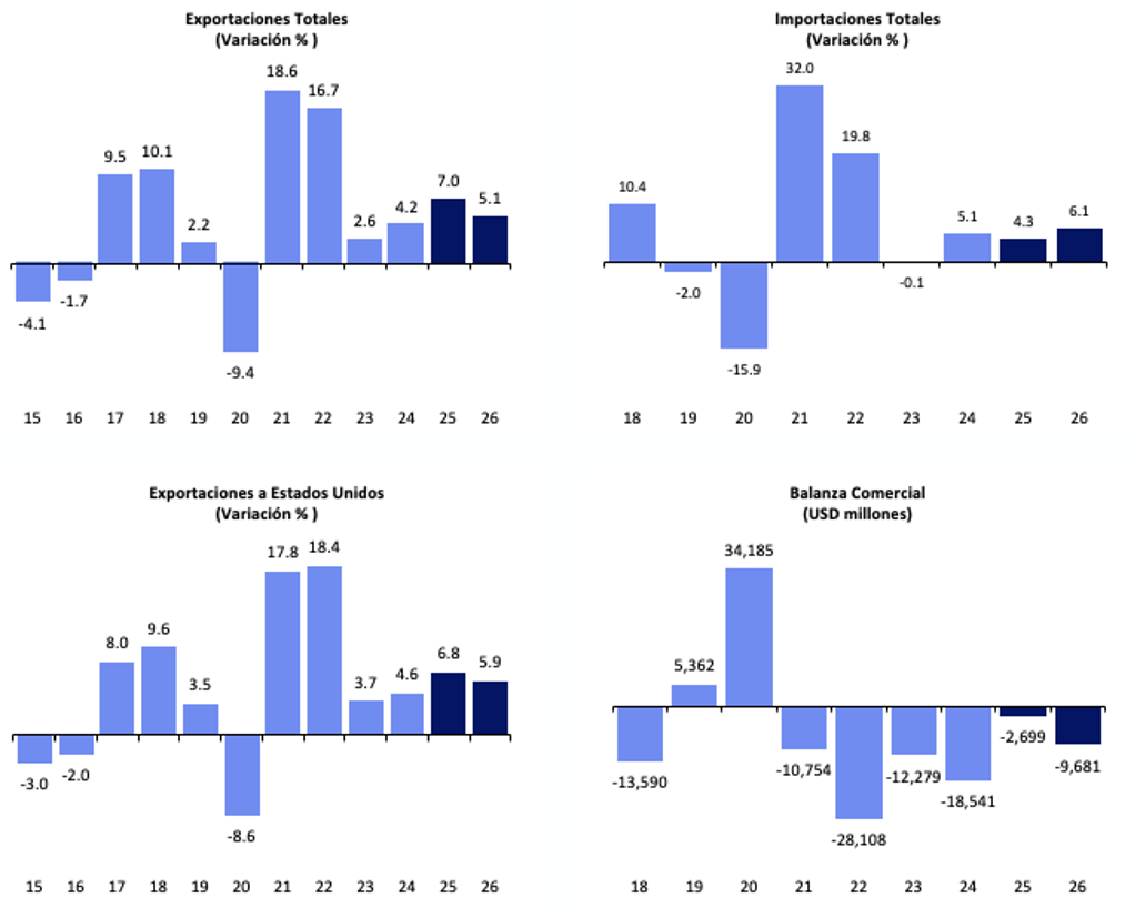 Las importaciones crecerían 6.1% en 2026, en condiciones en que se espera cierta estabilidad cambiaria y una recuperación de la economía nacional. En consecuencia, el déficit comercial estimado para el año entrante sería de USD 9,700 millones, un nivel moderado que no pone en riesgo el equilibrio de las cuentas externas.