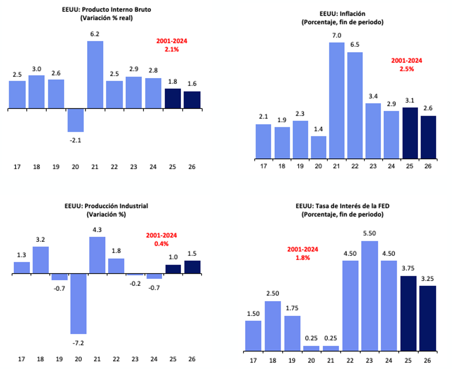 En septiembre, la inflación se ubicó en 3.0% anual, con cierto ascenso en los meses recientes. Podría cerrar 2025 en 3.1% y descender hacia 2.6% en 2026, aún por encima de la meta de 2% de la Reserva Federal (FED). Mientras tanto, la tasa de interés de la FED, que tras cerrar en 3.75% en 2025, descenderá medio punto porcentual (50 puntos base) en 2026, hacia 3.50%.