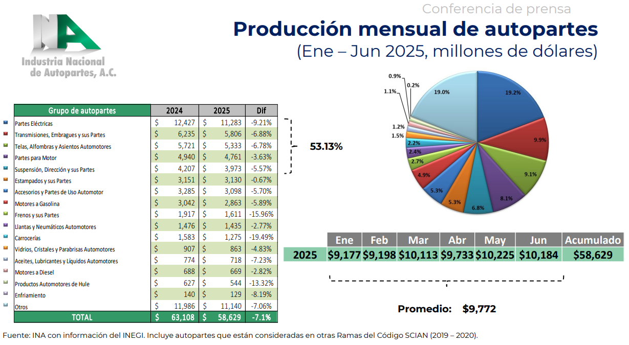 Ciudad de México, 9 de septiembre de 2025.- La Industria Nacional de Autopartes (INA) presentó los resultados más recientes de la producción, exportación e importación de autopartes en México durante el primer semestre de 2025. Los datos reflejan una caída en la producción, pero también confirman el papel estratégico de México como principal proveedor del mercado estadounidense, mientras que China se consolida como un jugador relevante en la región.