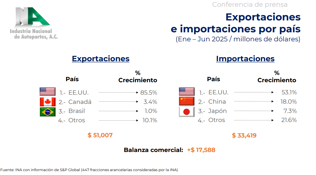 El vínculo con Estados Unidos continúa siendo fundamental para la industria mexicana. De acuerdo con el reporte, el 85.5% de las exportaciones de autopartes tuvo como destino ese país, seguido a gran distancia por Canadá (3.4%) y Brasil (1%). En términos de importaciones, el mercado estadounidense representó el 53.1% del total, mientras que China concentró el 18% y Japón el 7.3%. La balanza comercial de México en el sector arrojó un superávit de 17,588 millones de dólares, con exportaciones por 51,007 millones frente a importaciones de 33,419 millones.