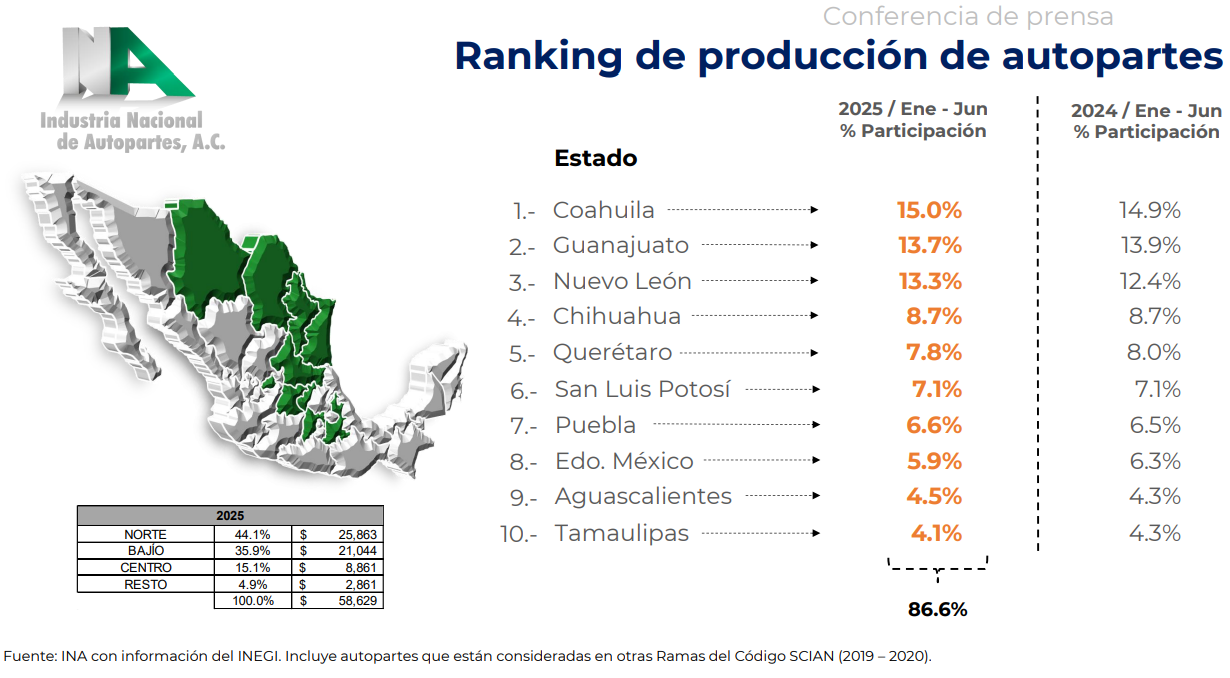 Entre los estados, Coahuila encabeza el ranking con 15% de participación, seguido de Guanajuato (13.7%), Nuevo León (13.3%), Chihuahua (8.7%) y Querétaro (7.8%). Otros jugadores relevantes son San Luis Potosí (7.1%), Puebla (6.6%), Estado de México (5.9%), Aguascalientes (4.5%) y Tamaulipas (4.1%). Estas diez entidades concentran más del 80% de la producción nacional, lo que confirma la fortaleza industrial de corredores estratégicos como el norte y el Bajío.