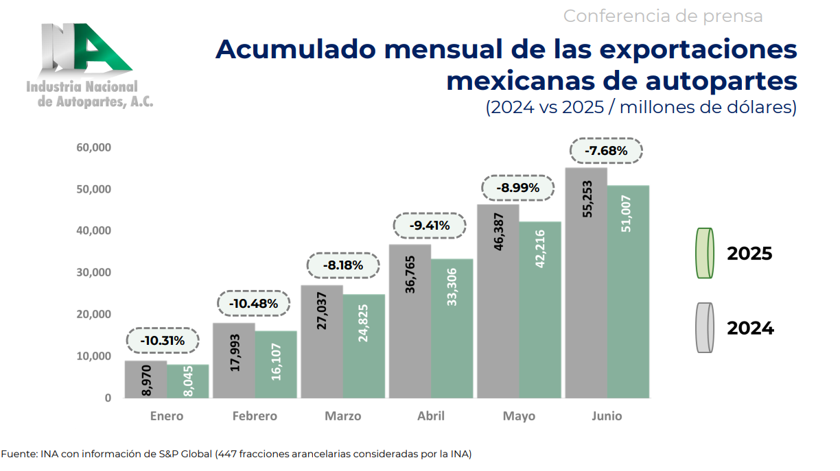 Los resultados también muestran caídas en las exportaciones mexicanas de autopartes durante el primer semestre de 2025. En términos acumulados, las ventas al exterior registraron descensos mensuales que oscilaron entre -7.68% y -10.48%, respecto al mismo periodo del año anterior. A pesar de esta tendencia negativa, México mantiene el primer lugar como proveedor de autopartes para el mercado estadounidense, por encima de China, Japón y Canadá.