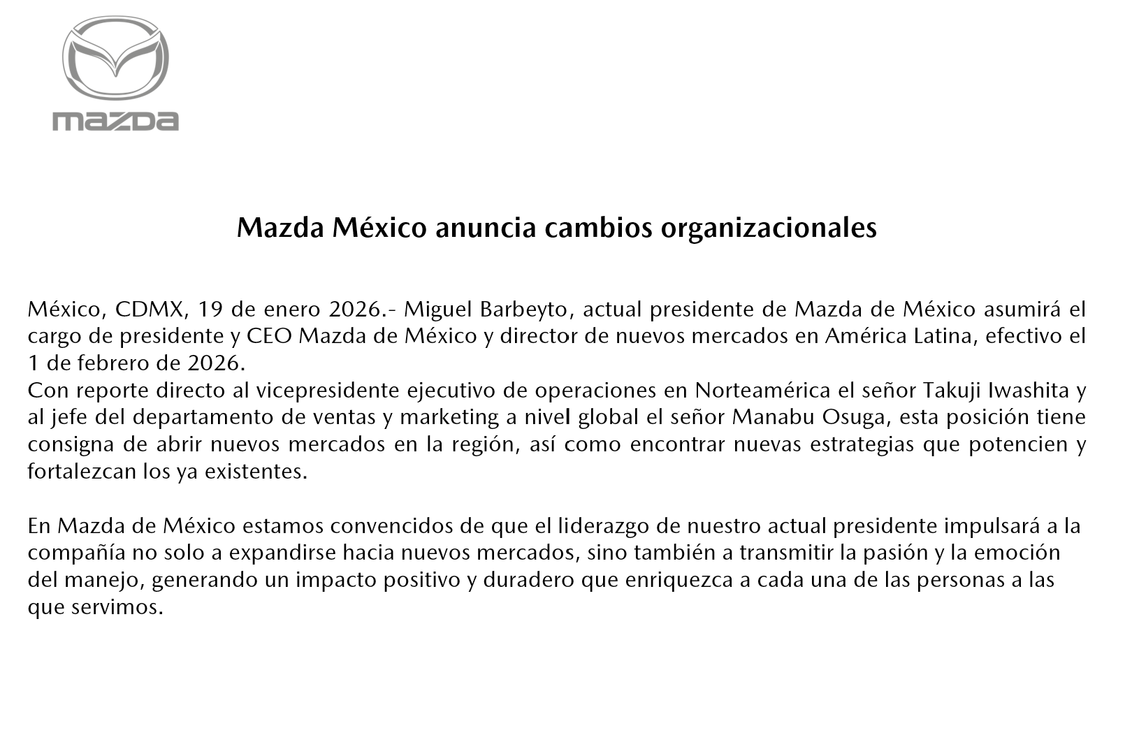 Con este movimiento, Mazda de México reafirma su apuesta por una dirección regional alineada con la estrategia global de la compañía, orientada al crecimiento sostenido y a la consolidación de su presencia en América Latina a partir de una visión de largo plazo y un liderazgo con enfoque en el desarrollo de nuevos mercados.