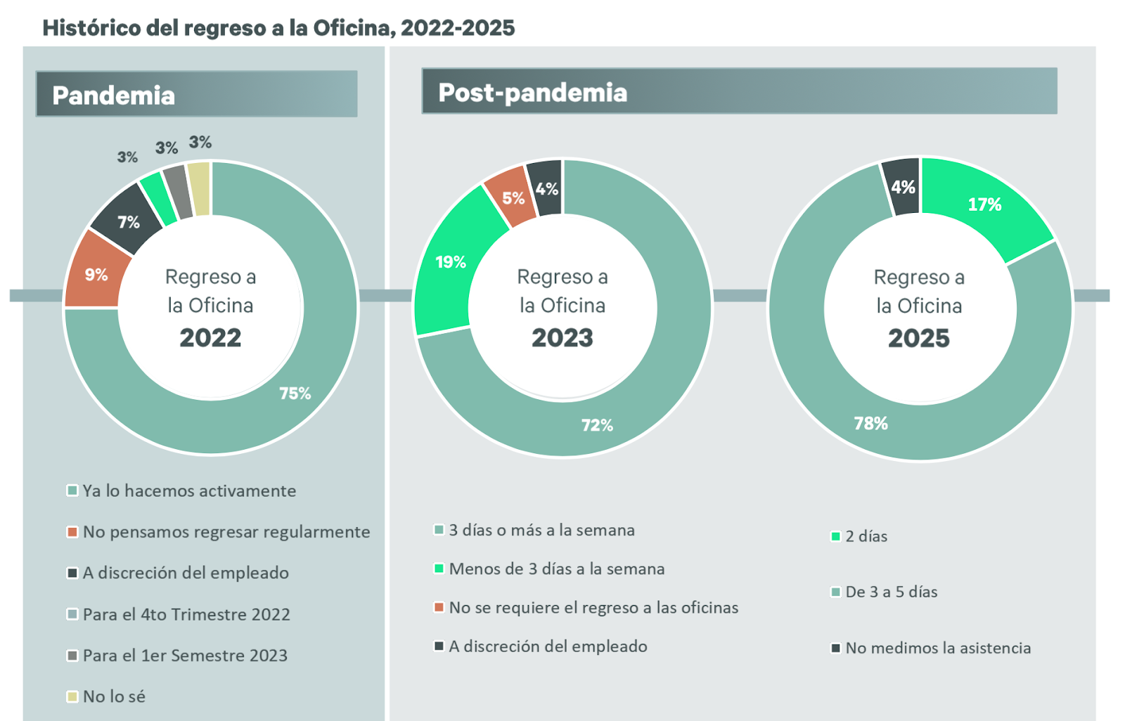 El año 2022 marcó un periodo inicial de retorno a la normalidad, aunque también de incertidumbre. Las empresas ya habían activado el regreso presencial a sus oficinas en un 75%, en tanto que un 25% ya había optado por un esquema híbrido con regresos paulatinos. Sin duda, fue un momento de equilibrio entre la necesidad de recuperar la actividad habitual y la cautela ante la persistencia de la pandemia.