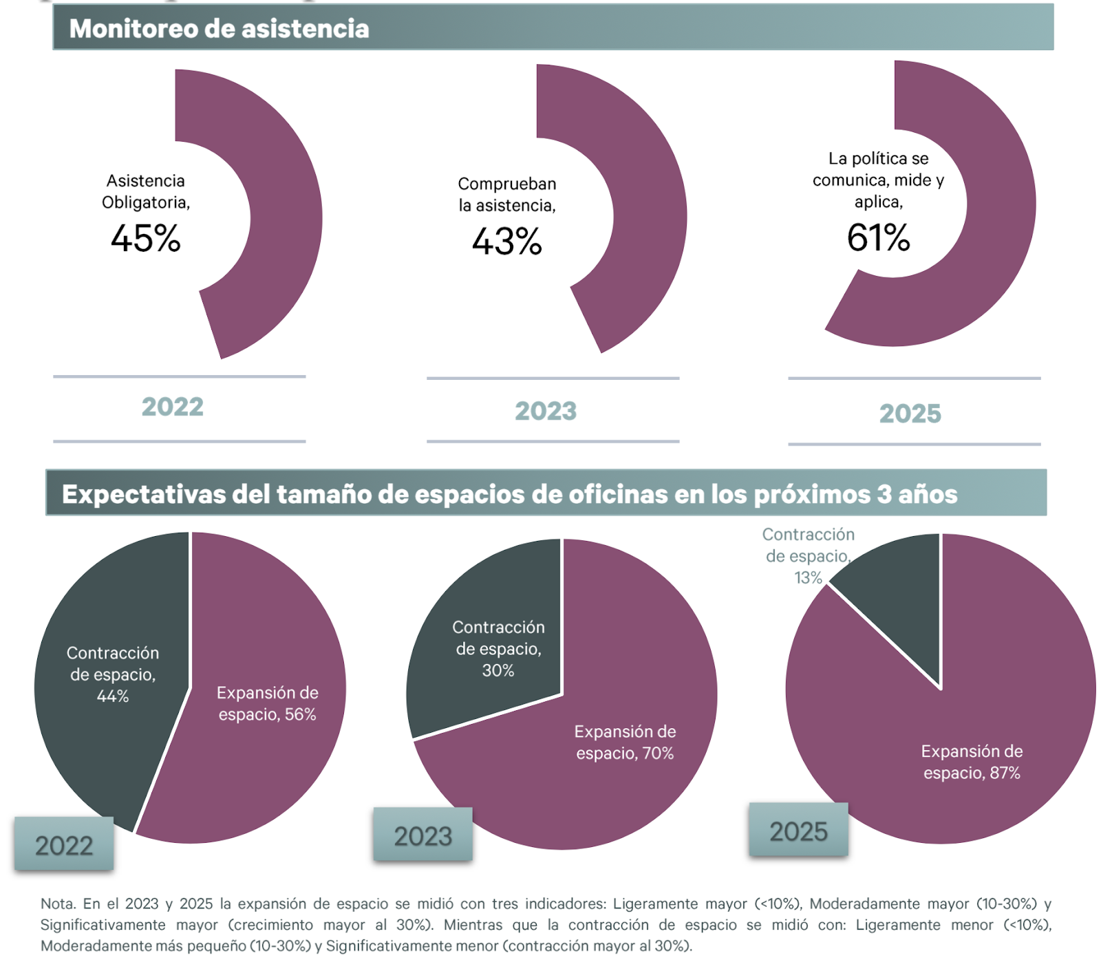 2025. Las proyecciones indican una consolidación del modelo híbrido con una medición establecida estructuralmente. Respecto al tamaño de los espacios de oficina, se anticipa un aumento moderado en la mayoría de los casos y un crecimiento mayor en una porción importante de empresas.