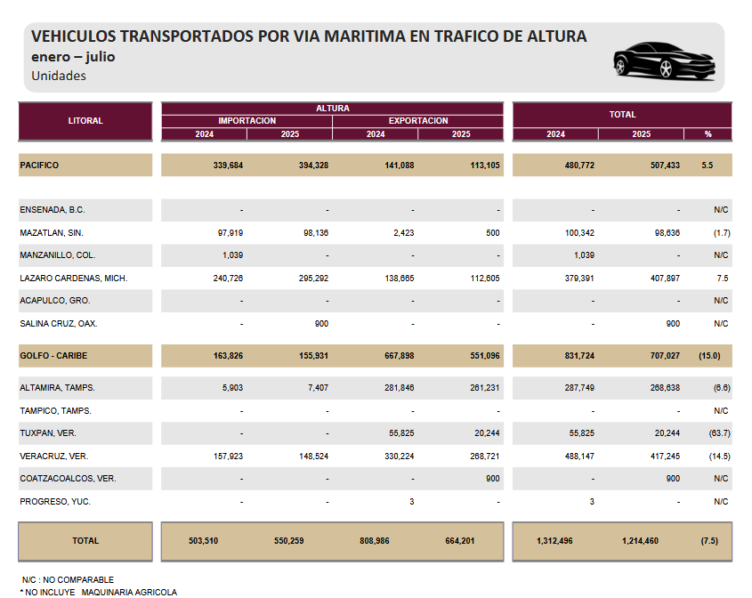 Lázaro Cárdenas, Michoacán, 15 de agosto de 2025.- Durante los primeros siete meses de 2025, el transporte marítimo de vehículos en tráfico de altura en México totalizó 1,214,460 unidades, lo que representa una disminución del 7.5% en comparación con las 1,312,496 unidades registradas en el mismo periodo de 2024.