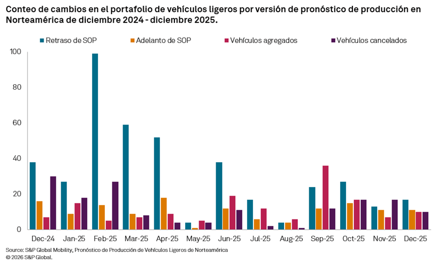 En S&P Global Mobility monitoreamos los cambios en cada versión de nuestro pronóstico de producción, incluyendo movimientos de fechas de SOP y EOP, así como cancelaciones de plataformas o programas. La mayoría de los cambios en las ediciones del pronóstico provienen de OEMs con estrategia de plataformas paralelas, las cuales, en los últimos años han tenido la tendencia de operar plantas de gasolina a máxima capacidad y plantas de BEV subutilizadas.