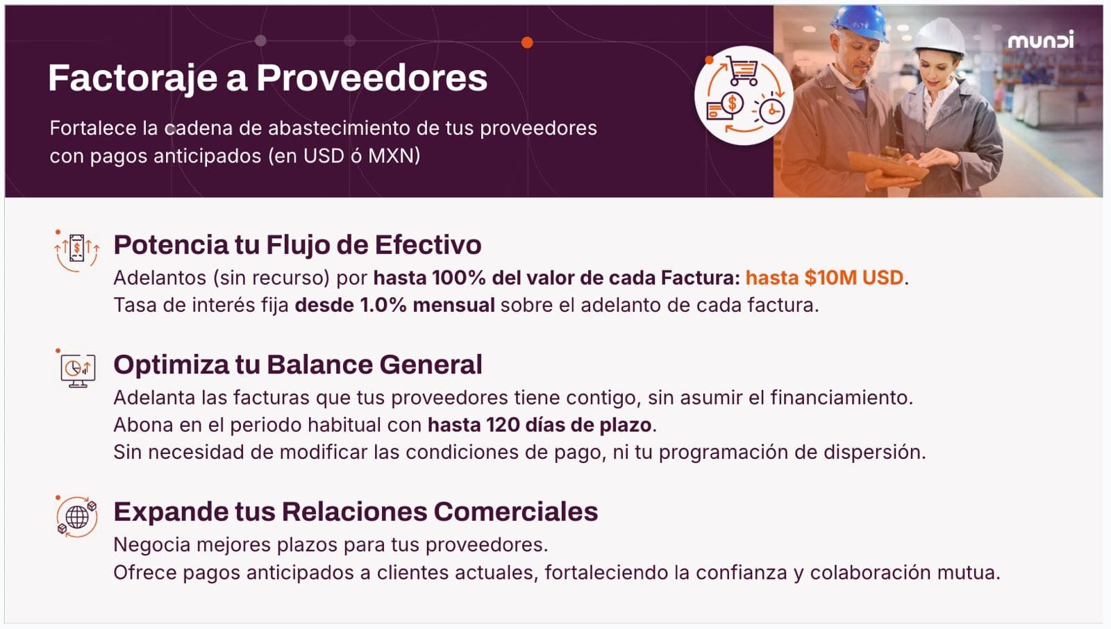 Con Factoraje a Proveedores, MUNDI proyecta apoyar a más de 500 empresas exportadoras que forman parte de alguna cadena de suministro en el país, con más de $20 mil millones de pesos mexicanos para consolidar a las PyMEs en México como actores estratégicos dentro de las cadenas globales de valor.